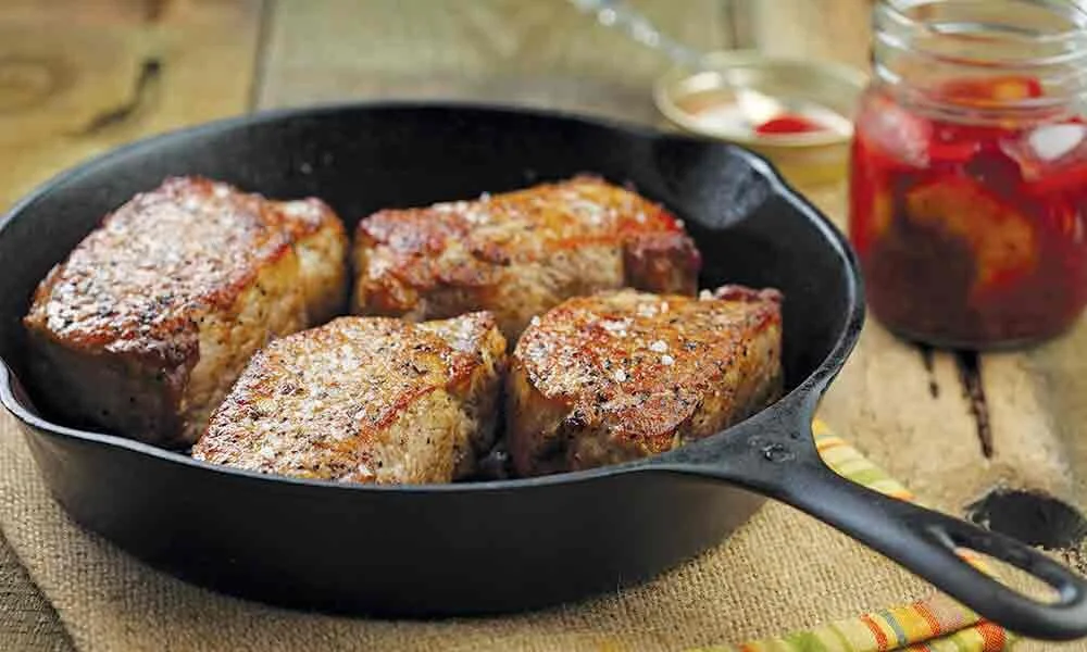 Pan Frying requires adding oil to a skillet and cooking at high heat until the surface is golden brown. Reduce heat to medium and cook until meat reaches an internal temperature of 160°F (71°C). Use a non-stick skillet to reduce or eliminate added oil.