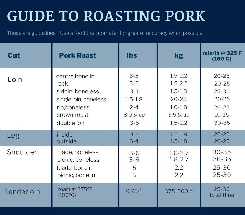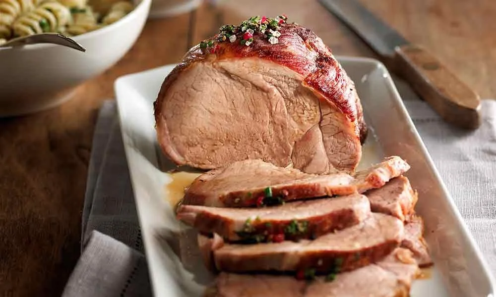 Roasting is suitable for larger cuts. The meat is cooked uncovered on a rack in a roasting pan. For best results, cook in a pre-heated oven at a temperature of 325°F (160°C); the tenderloin can be cooked at 375°F (190°C). To check doneness, insert a food thermometer into the centre or thickest part of the roast away from fat or bone. Remember to allow for a 5°F (3°C) rise in temperature after removal from the oven, cook shoulder roasts to an internal temperature of 175°F (80°C), leg and loin roasts to 160°F (71°C). Cover loosely with foil and let stand 10–15 minutes before carving. All ground meat, including sausages, must be cooked to 160°F (71°C).