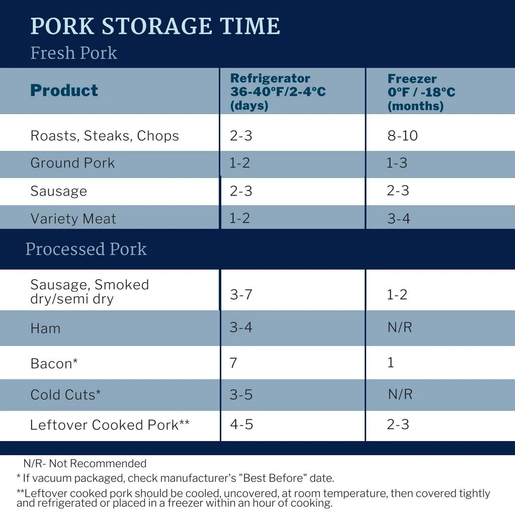 The following are some handy tips for the proper storage of fresh pork. Keep in mind that these are general guidelines; always read the label and check “packaged on” or “best before” dates. If properly stored, pork can be easily frozen for later use and then defrosted in the refrigerator or microwave. Meat defrosted in the microwave should be cooked immediately.