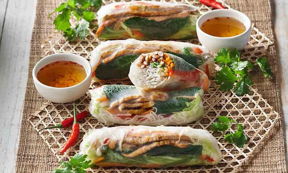 Arrange ingredients horizontally along the bottom 1/3 of the rice paper, careful not too overstuff. Drizzle with 1/2 Tbsp (7 mL) over the filling.