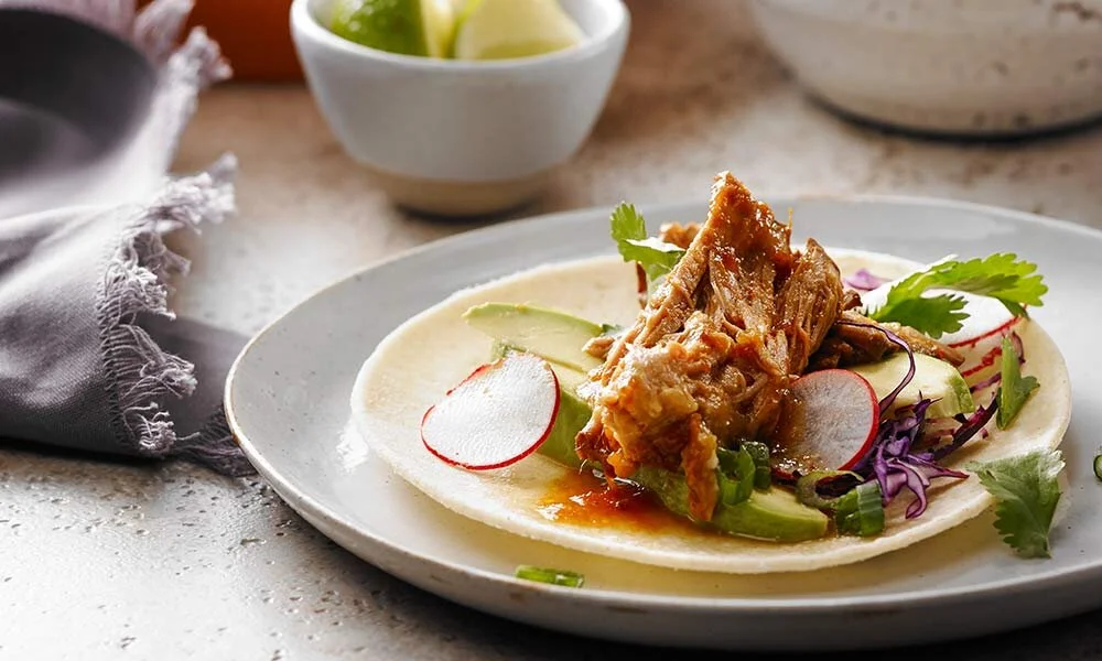 Pork shoulder slowly braised in lime juice, salsa, garlic, and cumin makes darn delicious carnitas. Juicy and flavourful, this meat is the perfect accompaniment to warm corn tortillas. Put all of the toppings in the centre of the table and let everyone fix their carnitas as they see fit!
